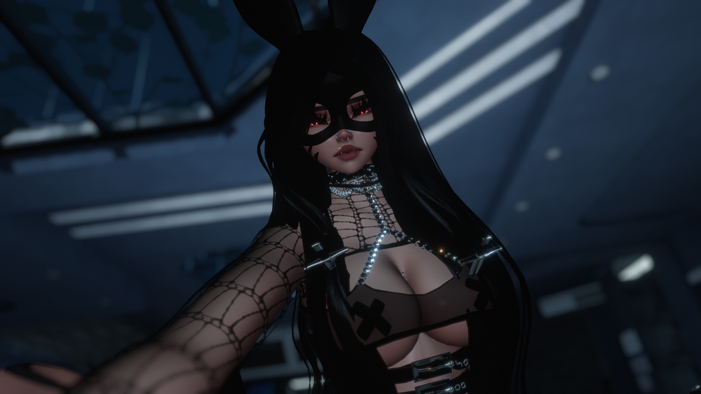 Mouth tag, Fishnet, Top, Panties, Choker, Harness Heels, Short Heels, Ponytail, Long wavy hair, Long straight hair, Bunny mask, Knives, Rings, Sexy belt, Straps, Pasties, Piercings, Garters